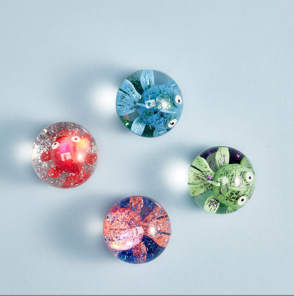 A light-up bouncing ball. Colorful fishes inside. 2 3/4" Diameter;  Plastic